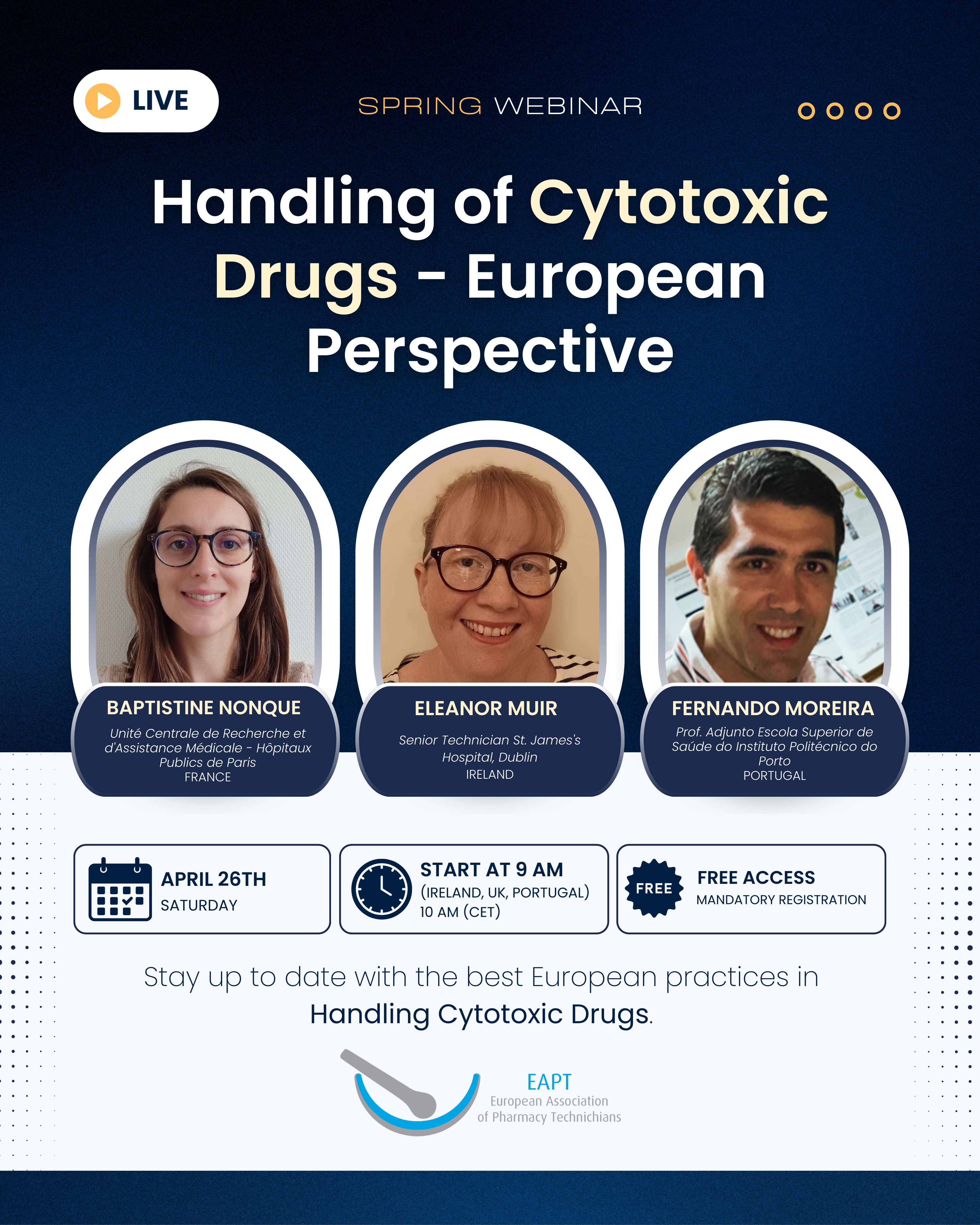 The European Association of Pharmacy Technicians (EAPT) -Academic Network hosted a successful spring webinar on April 26th, titled “Handling of Cytotoxic Drugs – European Perspective.”